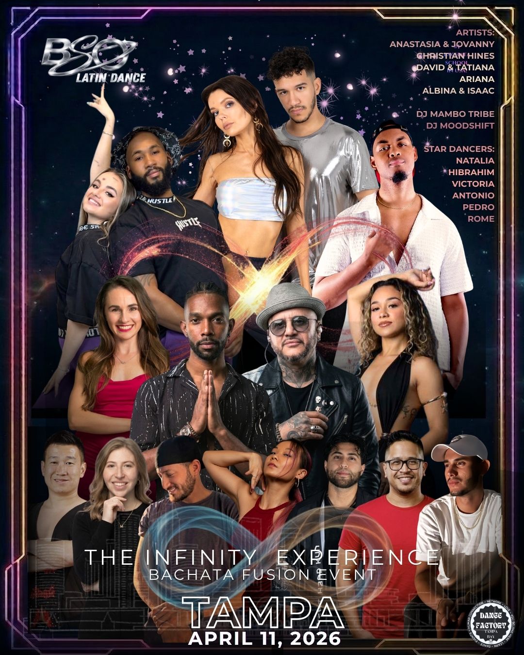 π BSO Takes Tampa! A full day of world-class bachata instruction capped off by a Galactic Disco social to remember. Workshops, dance battles, and the Bachata Infinity experience β all under one roof at The Dance Factory in Tampa Bay.